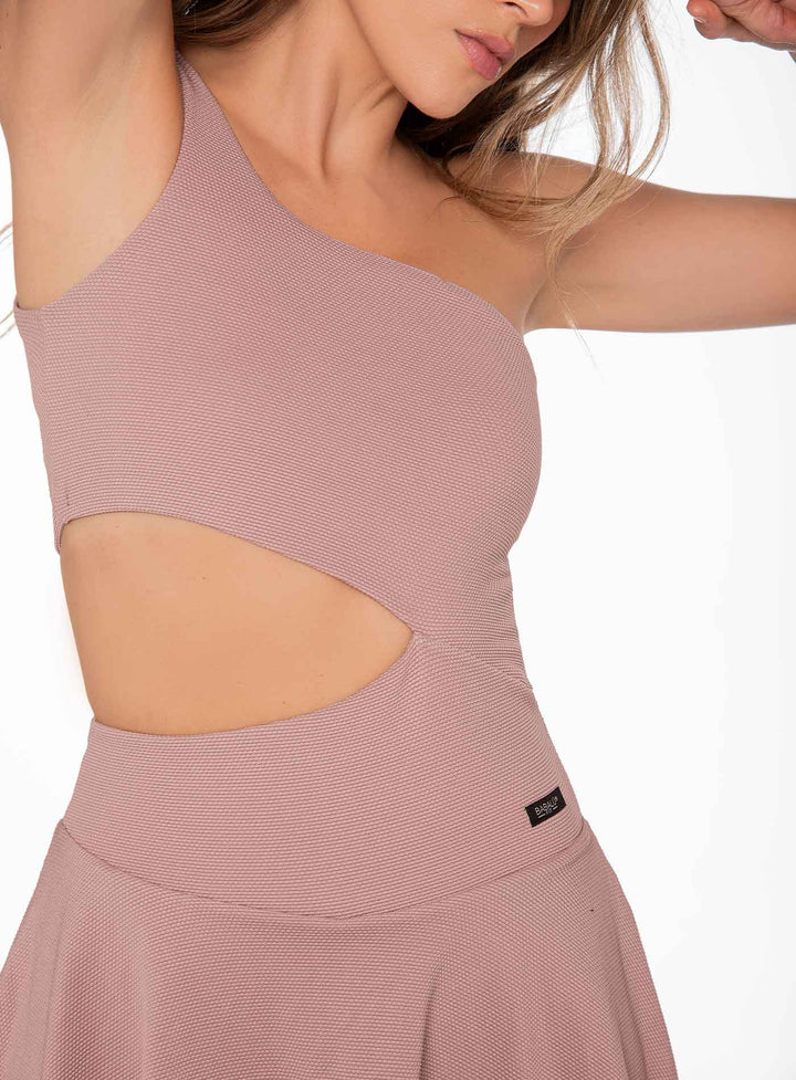 SHORT DRESS WITH ASYMMETRIC NECKLINE, CUT-OUT ON THE SIDE, AND SIDE POCKET ON THE INTERNAL SHORTS
